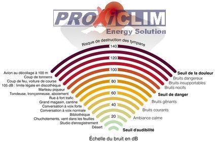 Le niveau sonore induit par cet air pulsé est mesuré et noté sur les fiches descriptives de chaque unité intérieure et extérieure de climatiseur. L'unité de mesure est le décibel (dB(A)). Pour exemple, 20 dB(a) correspondent à un jardin calme, 40 dB(a) un bureau, 50 dB un restaurant calme et 100 dB(a) un klaxon.